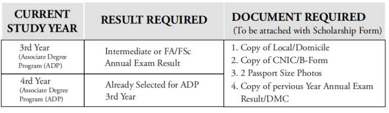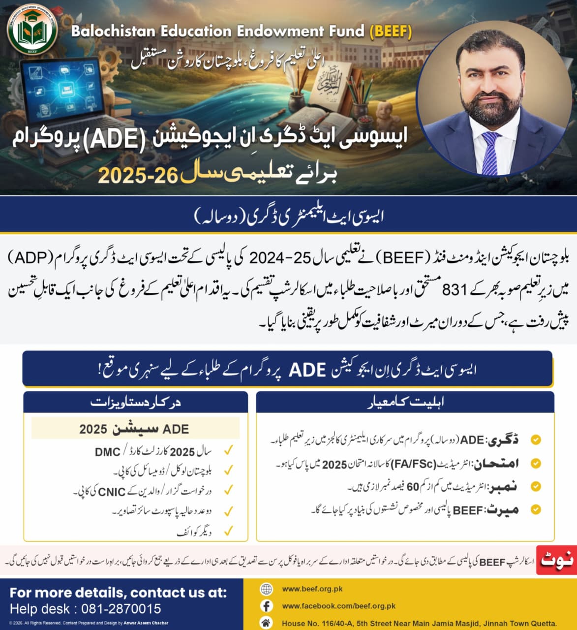 Students of Balochistan studying in Associate Degree in Education (2 years) in Balochistan can apply on the basis of their previous year's Intermediate (FA/FSc or Equivalent) Annual Exam Result, securing at least 60% marks, and are currently enrolled inĀ  ADE or equivalent. Merit will be decided amongst the submitted BEEF Scholarship Forms in each category as per the allocated number of slots.