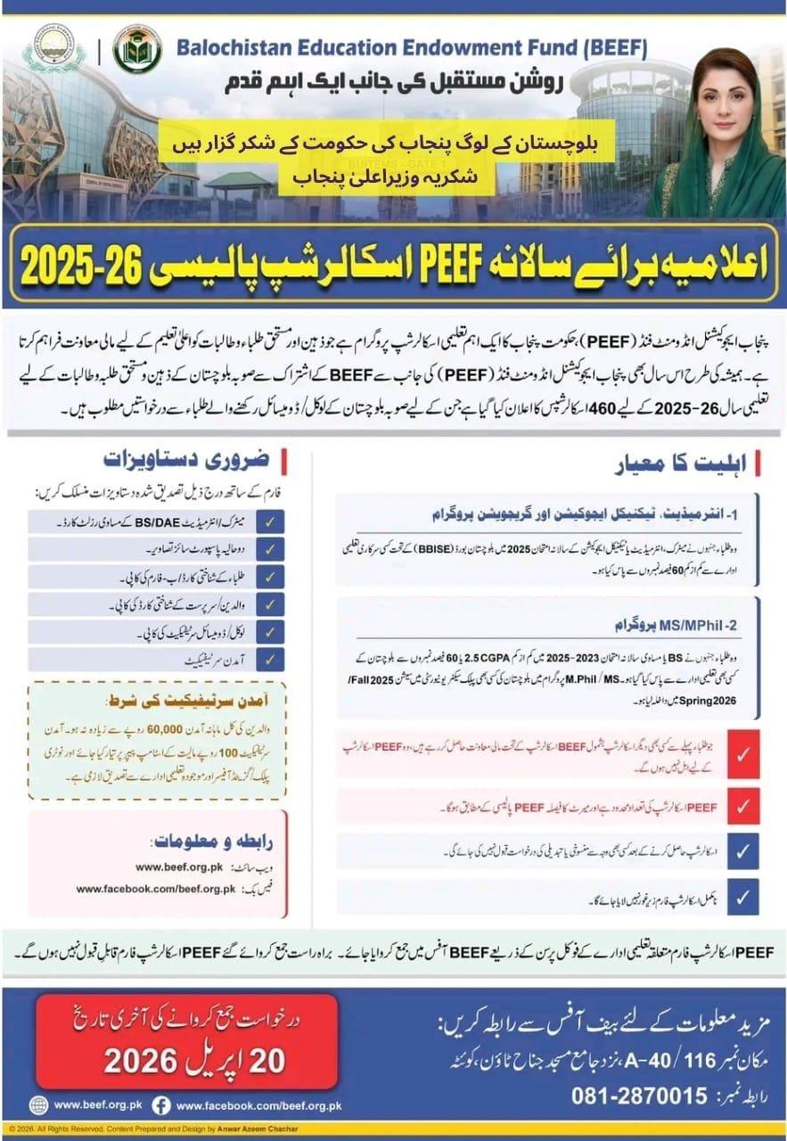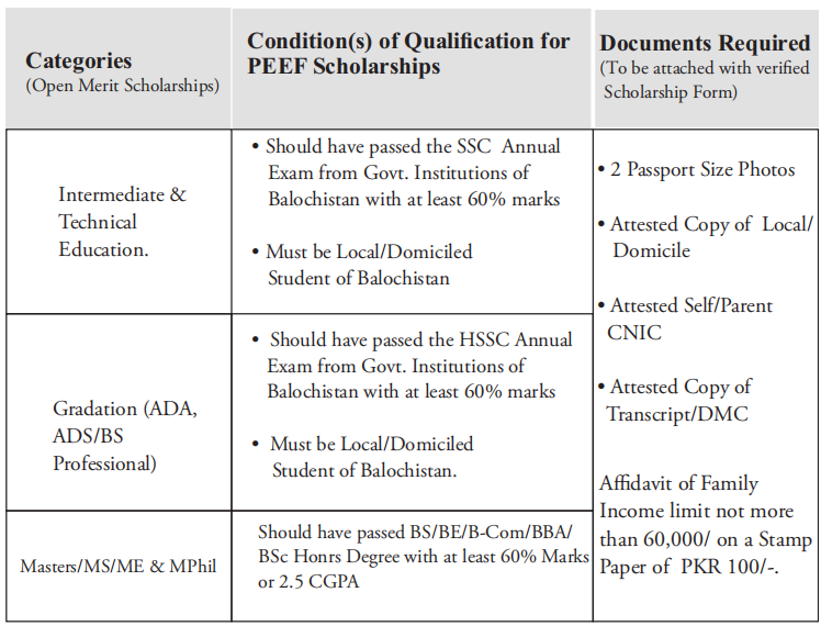 The Punjab Educational Endowment Fund (PEEF) under the umbrella of Balochistan Education Endowment Fund (BEEF)  allocates around 460 slots of scholarships each year for the deserving students of Balochistan. The scheme covers Intermediate (FA/FSc/DAE) & equivalent, Gradation (ADA, ADS/BS Professional), Master and MS/MPhil levels of education as per given detail: